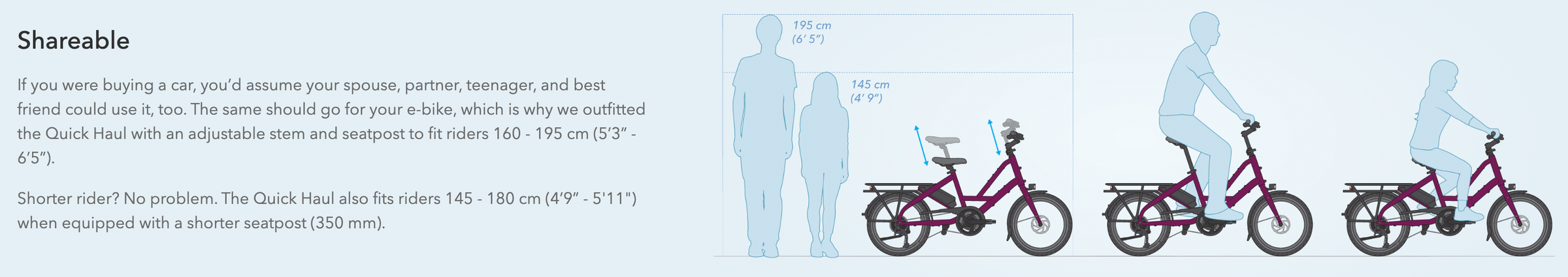 The Quick Haul is a built-to-last compact e-bike that’s ready to tackle your daily grind. The multitool of e-bikes: small and unassuming enough to be your daily go-to, yet capable of handling big jobs with finesse. The Quick Haul makes doing stuff by bike practical, easy, and fun—so you’ll reach for it just about every day. It’s designed to help you carry passengers and cargo with ease, and it’s a joy to ride. A compact, space-saving design simplifies storage and transport. The short, low-capacity rear racks found on most city bikes limit how much you can do by bike (and make defaulting to a car more likely). The Quick Haul features an extra-long rear rack with a 110 lb capacity, so you can do a lot more—from hauling groceries to giving your kid a lift to school. Add an optional front rack to do both at once.